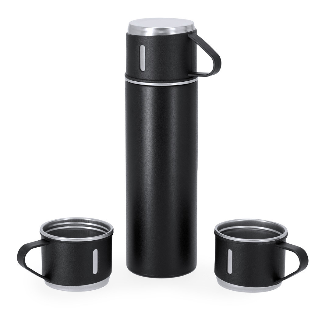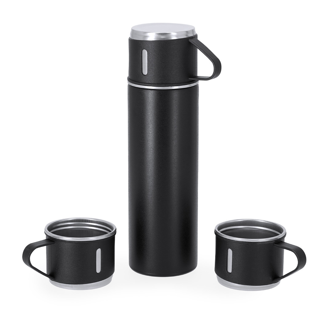Set de termo con 3 tazas fabricado en acero inox. Termo de 420 ml de capacidad y de doble pared, que garantiza una mejor y más duradera conservación de la temperatura, con dosificador de seguridad. Tazas de 140ml, ajustables mediante rosca y en elegante diseño negro, ideales para disfrutar de la bebida, ya sea caliente o fría, en cualquier momento y lugar. Presentación en elegante estuche de color negro. Termo 420 ml. 3 Tazas 140 ml